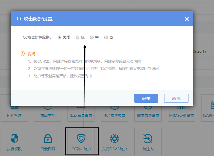 在  云虚拟主机详情  -->CC攻击防护设置  如图